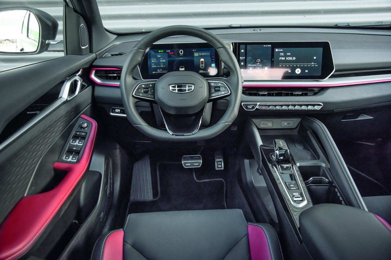 Dojam u unutrašnjosti svakako podiže i bogata oprema, pa tako Coolray već od starta dolazi nakrcan svakojakim vozačkim gadgetima i besprijekorno digitaliziran. Prvo što upada u oči su primjereno pregledna instrumentna ploča od 10,25 inča s prilagodljivim prikazima i veliki, 12-inčni zaslon multimedije. Ta su dva zaslona postavljena u istu visinu i pomodno naoko spojena, pa pogled ne bježi dugo s ceste kad vozač poželi promijeniti prikaz ili, primjerice, izabrati drugi program vožnje (nude se Eco, Comfort, Sport i Smart).